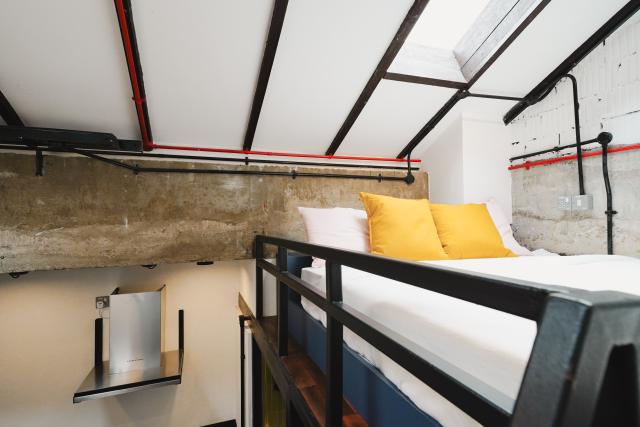 This huge shophouse for rent boasts an industrial-inspired interior that exudes a robust charm. Each studio for rent within this building offers a unique loft-style bed, a convenient kitchenette, and ample private space. Unwind in the various lounge areas, complete with comfortable living rooms, inviting dining areas, and well-equipped kitchens.